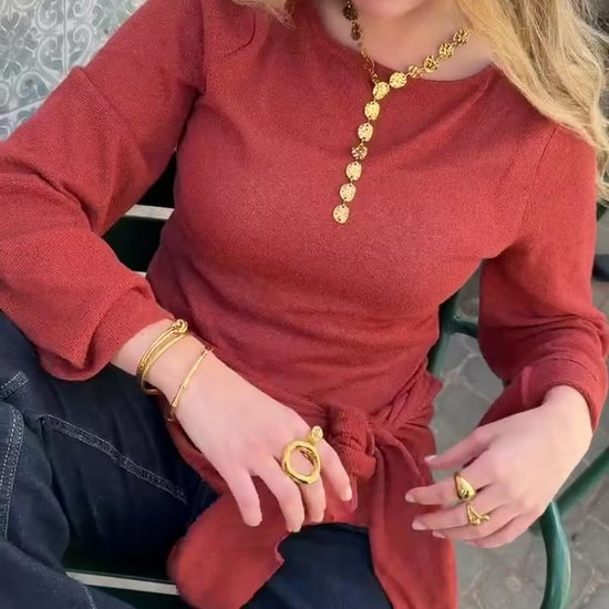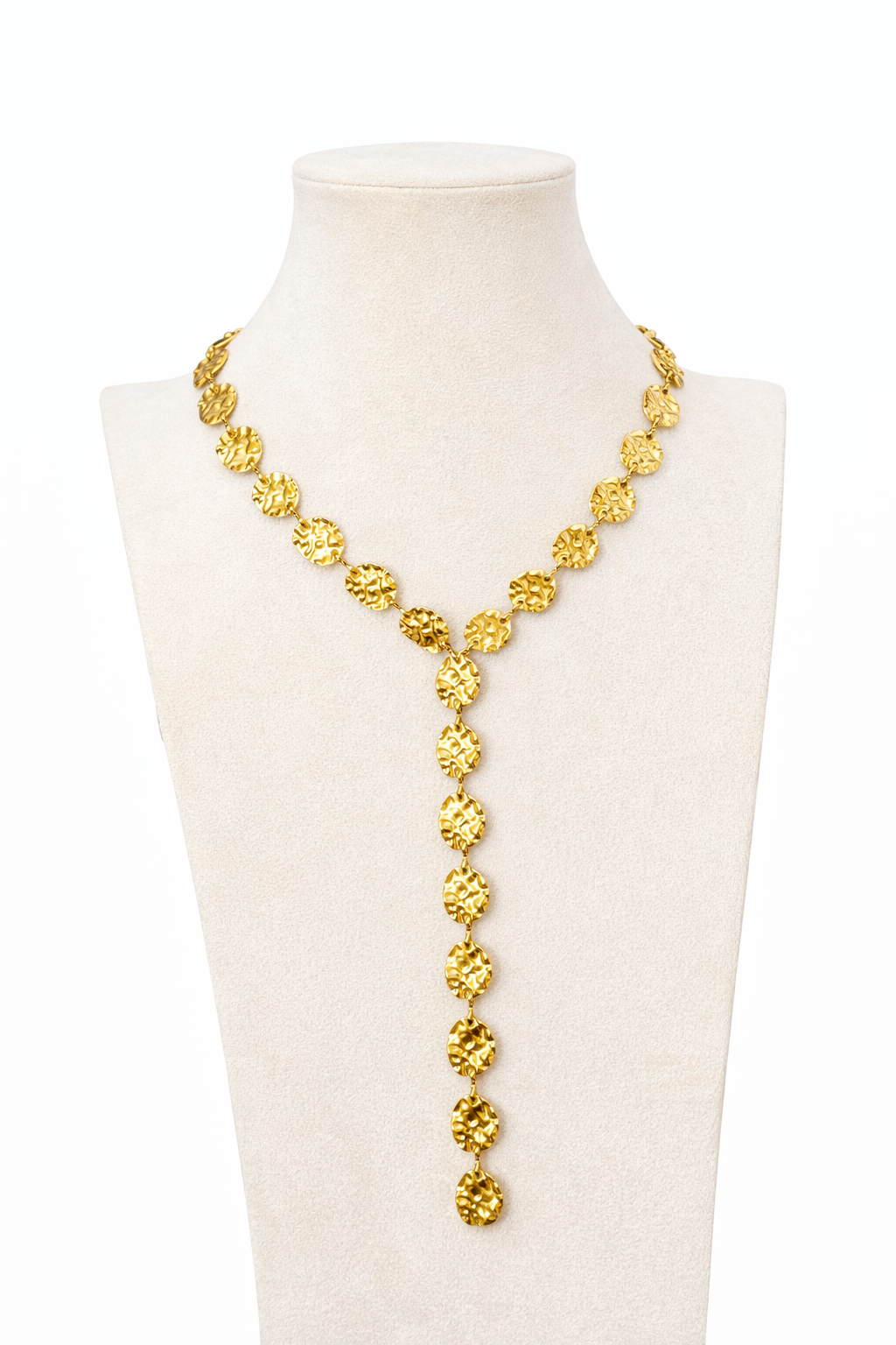 Elegante e marcante, o Colar Valeria Drop é uma peça que não passa despercebida. Com um design sofisticado em forma de “Y”, é composto por discos texturizados que refletem a luz de forma delicada, criando um efeito luminoso e elegante ao movimento. O detalhe central alongado acrescenta um toque moderno e feminino, tornando este colar perfeito para elevar qualquer look — desde um visual minimalista até uma produção mais especial.